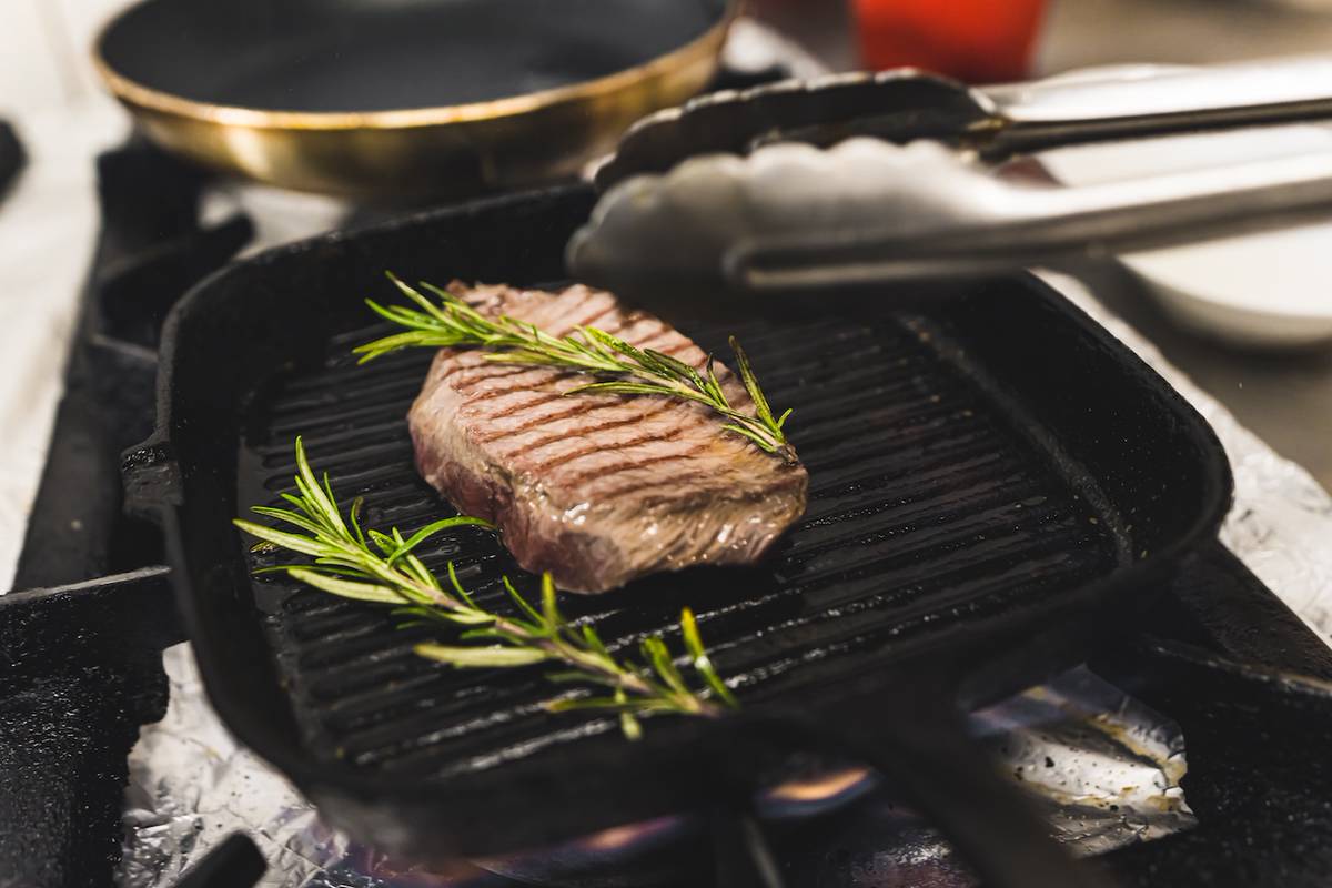 建議用厚底的鑄鐵鍋或不沾鍋,尤其是鑄鐵鍋具有蓄熱佳、導熱快又均勻等特性,非常適合煎牛排。另外,尺寸也應該選擇足以容納要煎的牛排,直徑應至少為25公分的鍋具。建議也另外準備小夾子用於煎牛排時翻面。